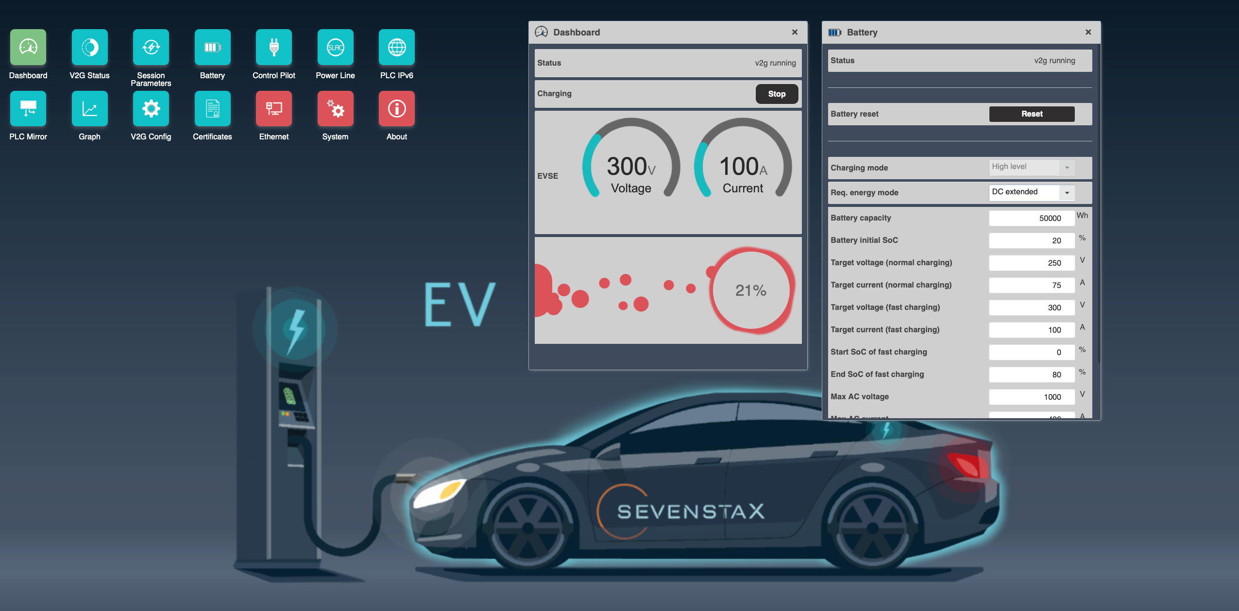 The SEVENSTAX V2G Simulator is a flexible and user-friendly tool designed to emulate either an Electric Vehicle (EV) or an Electric Vehicle Supply Equipment (EVSE) communication for development and testing purposes.